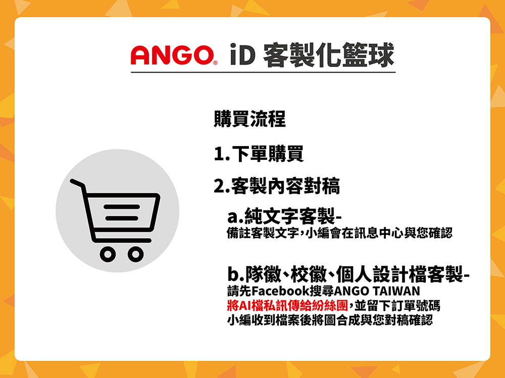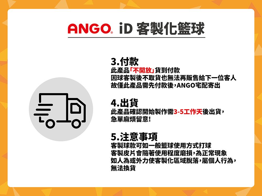 3.此產品「不開放」貨到付款因球客製後不取貨也無法再販售給下一位客人故僅此產品需先付款後,ANGO宅配寄出